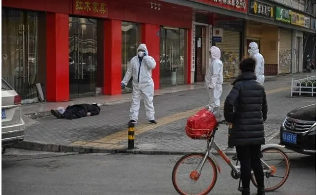 Çin’de sadece tehlikeli madde davalarına bakan polis ekipleri dün virüs salgınının sıfır noktası olan Wuhan’da kaldırımda ölü bulunan bir adamın cesedinin etrafında toplandı.