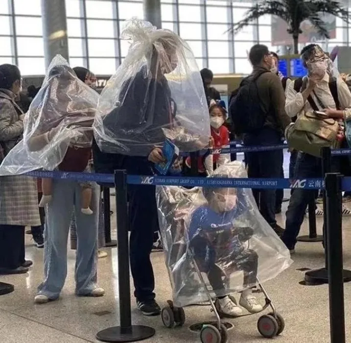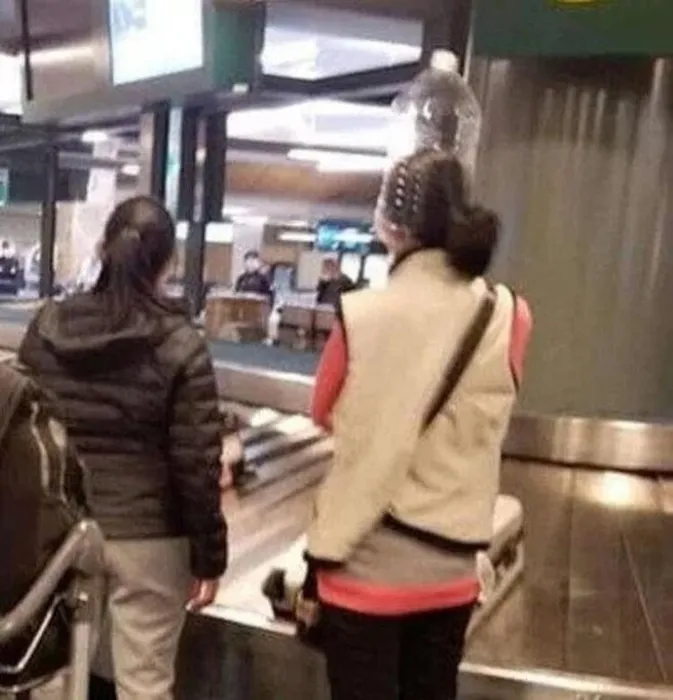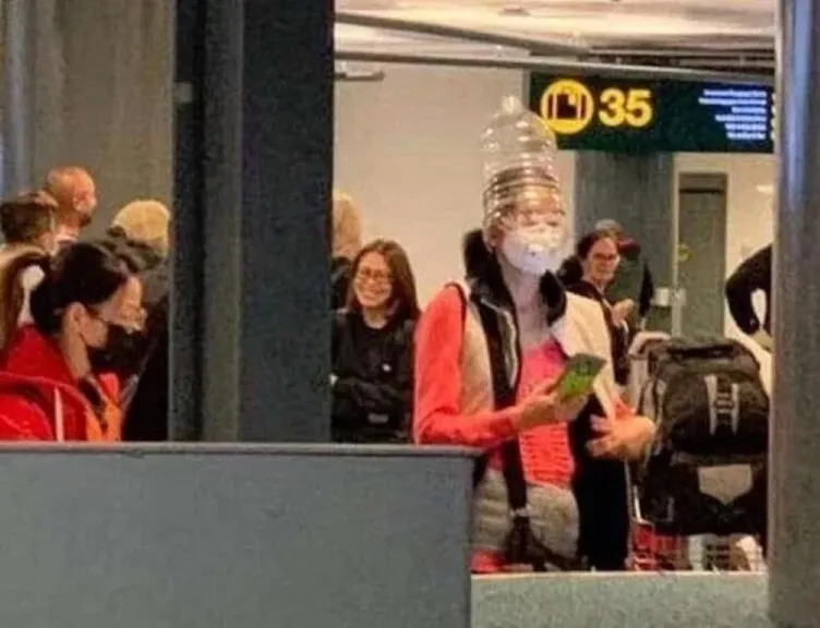 Çaresiz havayolu yolcuları, plastik şişeler, motosiklet kaskları, poşetler kullanarak kendilerini ölümcül coronavirüsünden korumaya çalışıyor.